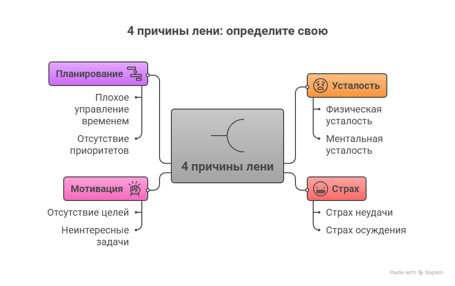 Прежде чем бороться с последствиями, важно понять корень проблемы. Лень — это всего лишь симптом. Чтобы избавиться от нее навсегда, определите, какой фактор мешает двигаться вперед в конкретном случае. Разберем наиболее распространенные причины прокрастинации.