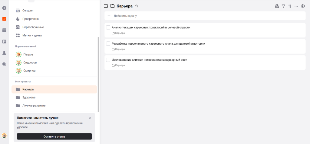 В ЛидерТаске удобно распределять задачи по проектам. Создайте папки «Карьера» или «Личное». Так вы увидите влияние каждого дела на качество жизни. Это помогает преодолеть нежелание работать.