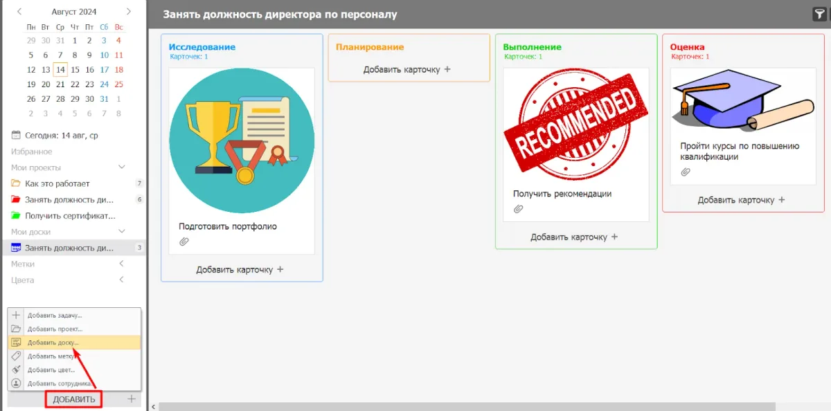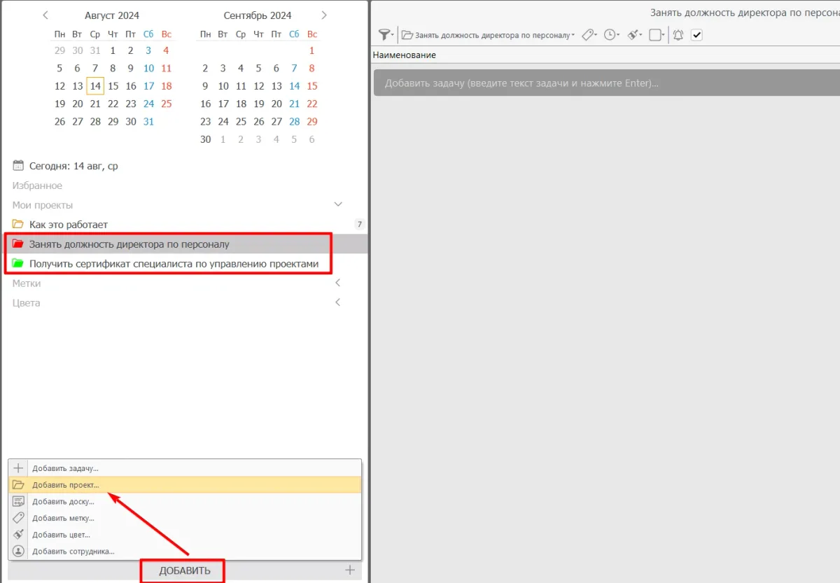- Проекты для долгосрочного планирования. Каждый крупный этап можно представить как отдельный проект. Например, «Занять должность директора по персоналу» или «Получить сертификат специалиста по управлению проектами». Потом можно будет разбить большую цель на более мелкие, управляемые задачи.