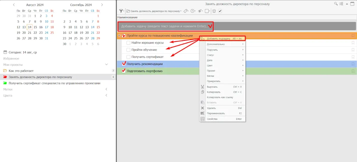 Например, Василий включил в проект такие задачи, как «Оценка текущих навыков», «Изучение возможностей продвижения внутри компании» и «Постановка долгосрочных карьерных целей». Каждую задачу он разделил на подзадачи, чтобы детализировать шаги, которые помогут ему двигаться по карьерной лестнице.