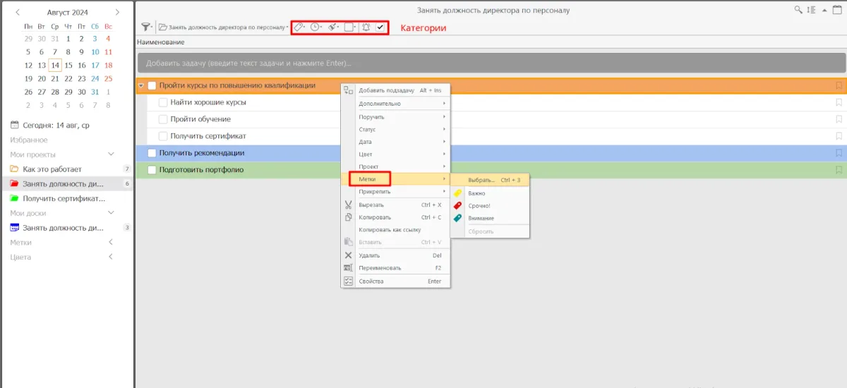 - Метки и категории для организации. Помогут группировать задачи по различным критериям: временным рамкам, статусу выполнения. Это поможет вам легко ориентироваться в вашем профессиональном плане и быстро находить нужную информацию.