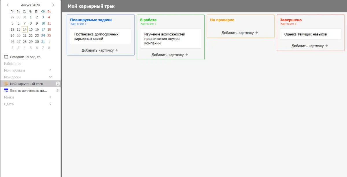 Теперь, когда Василий работает над задачей, например, «Изучение возможностей продвижения внутри компании», он перемещает её по колонкам, отслеживая прогресс. Это помогает ему оставаться сфокусированным и видеть, как его карьера развивается по заданному пути.