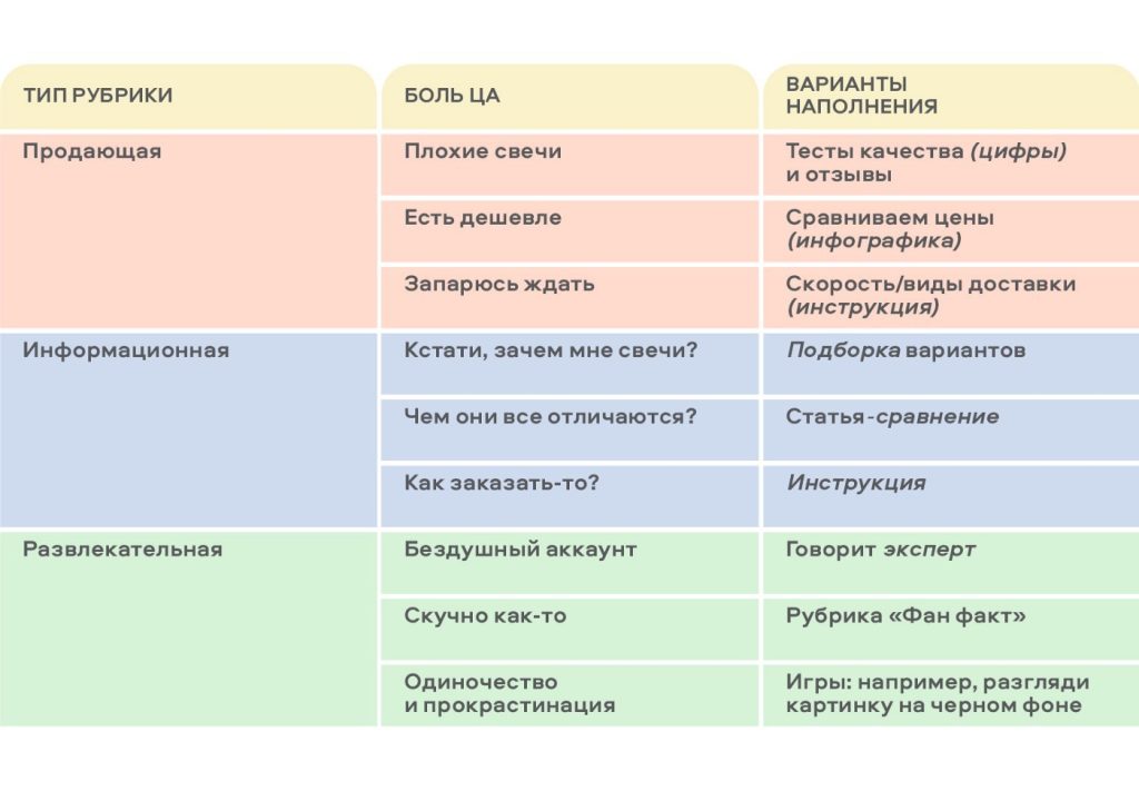 Тоже таблица, но вместо календарного плана с темами прописываются предполагаемые рубрики. Описание рубрик может меняться от обычного перечисления тем для постов, до описания болей целевой аудитории и вариантов наполнения. Такой контент-план позволяет без труда проследить, чтобы рубрики чередовались. В целом его вид очень простой и ни к чему не обязывающий.