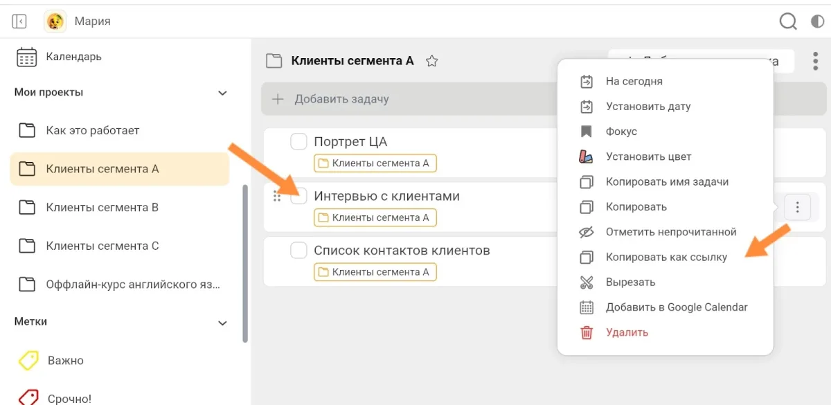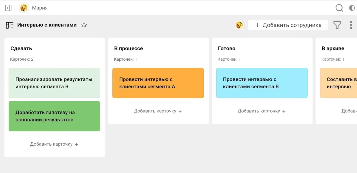 - Организовывайте задачи по этапам. Используйте одну папку проекта для одного этапа кастдева. В папке соберите задачи, которые необходимо решить на данном этапе.