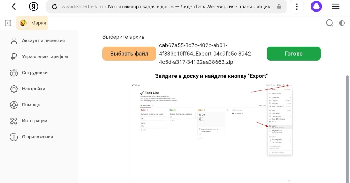 - Используйте интеграцию с другими инструментами. Например, вы можете представить часть информации на доске в Notion и интегрировать её в ЛидерТаск.