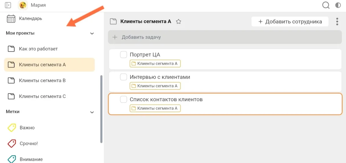 Поделив клиентов на сегменты, вы можете использовать для работы с каждой группой отдельную папку проекта в ЛидерТаске.