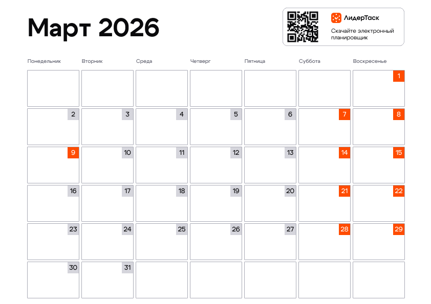 В марте 2026 года запланировано 21 рабочих дней и 10 выходных.