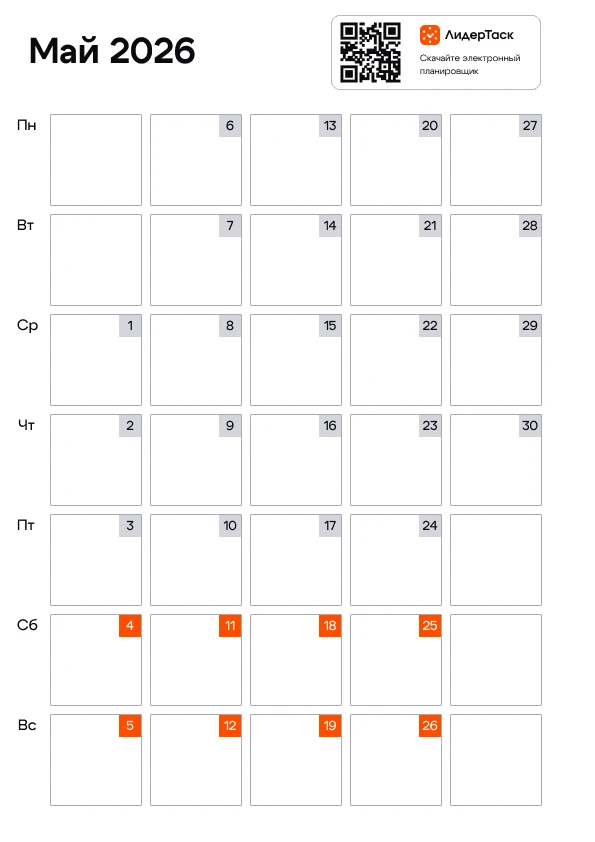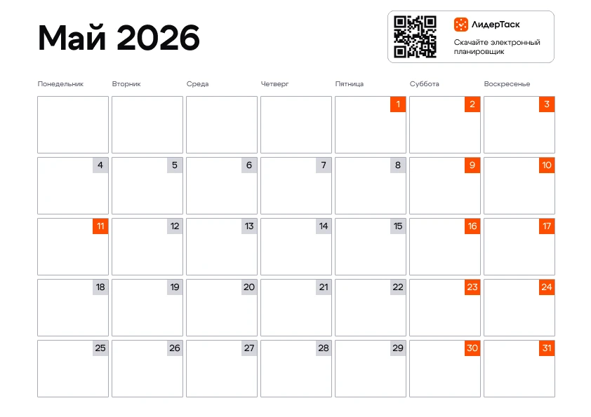 Хотите получить календарь на весь 2026 год? Просто зарегистрируйтесь в ЛидерТаск, отправьте свой e-mail в нашу техподдержку любым удобным способом — https://www.leadertask.ru/contacts, и мы пришлём вам архив с календарём на все 12 месяцев. Планируйте задачи и события на весь год, удобным для вас способом!