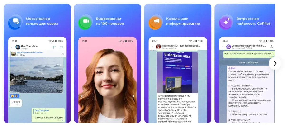 - Командные чаты: общение с коллегами в реальном времени.
