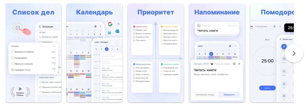 - Синхронизация между устройствами: доступ к задачам с телефона, планшета или компьютера.