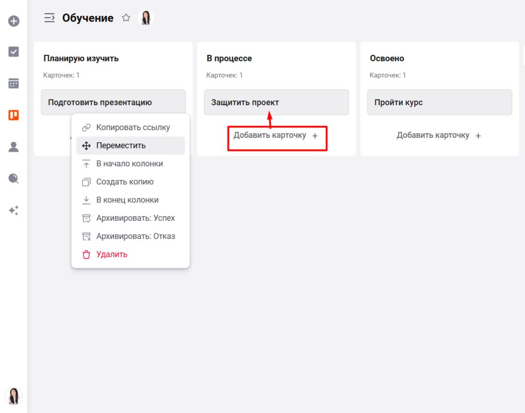 - Добавьте карточки. Каждая карточка — конкретная задача: пройти курс, защитить проект, подготовить презентацию.