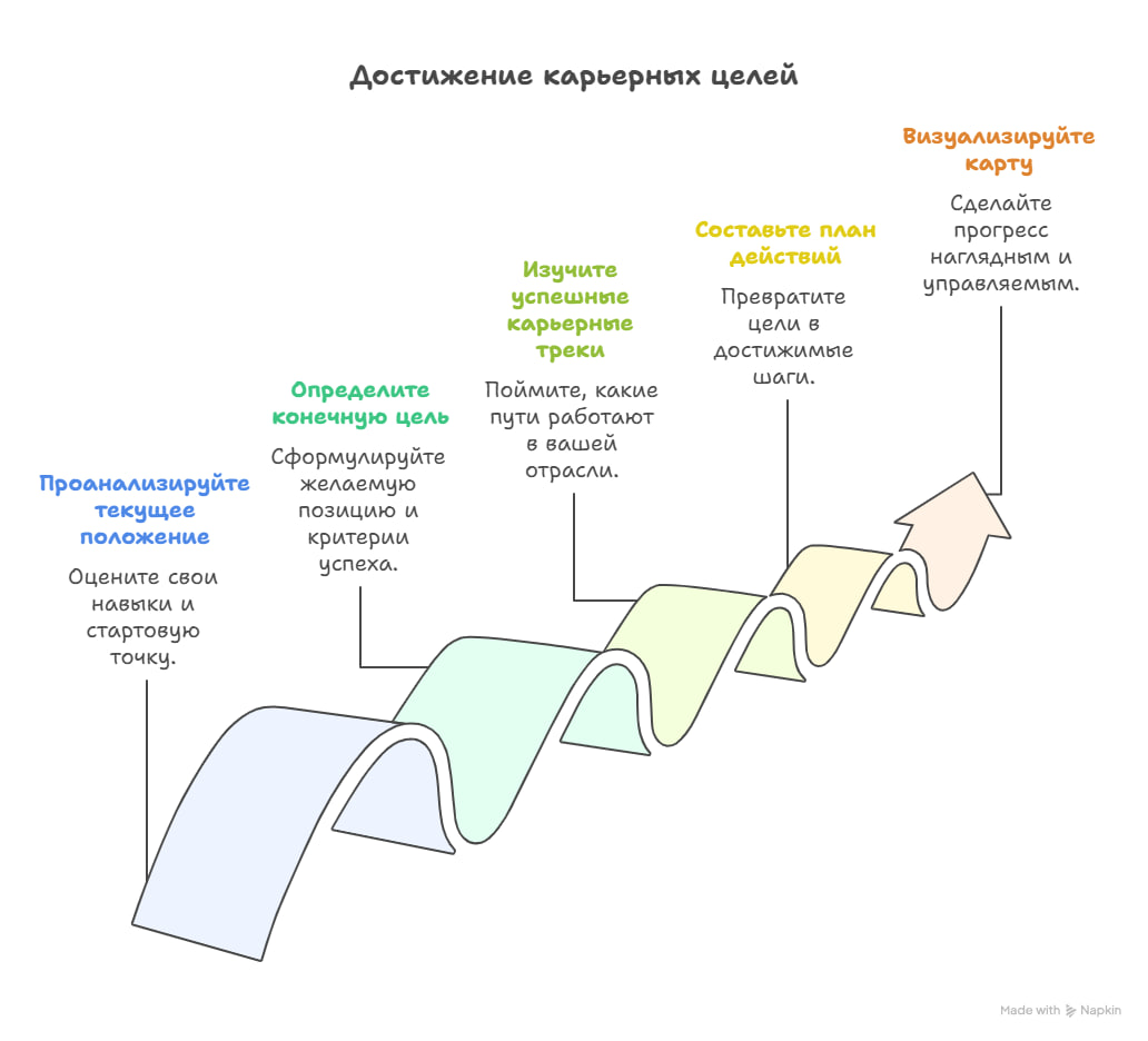 Карта карьерного роста (ККР) — наглядный план развития: от текущей должности и навыков до желаемой позиции и уровня дохода. Она помогает определить цели, выбрать направление и спланировать этапы профессионального роста. Такой подход полезен и менеджерам, и специалистам, и фрилансерам, и тем, кто только начинает работать.