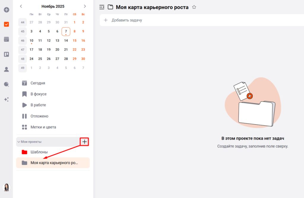 Начните с переноса своей карты в цифровую среду. Создайте отдельный проект, например «Моя карта карьерного роста» — это будет личный центр управления развитием.
