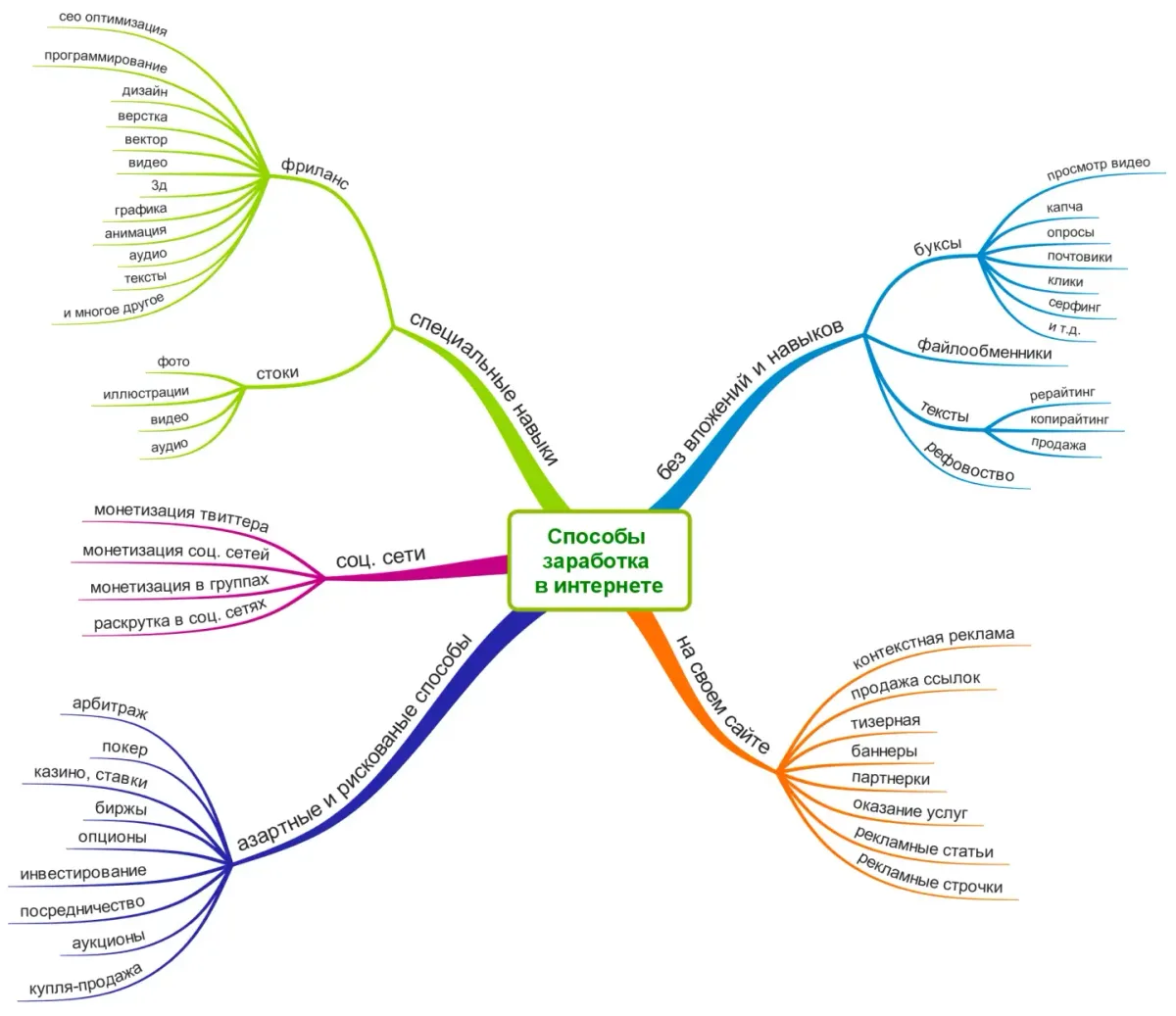 От центральной идеи отходят основные ветви, каждая из которых представляет ключевые аспекты темы. Например, определение, ключевые приемы, методы развития, применение в жизни, преимущества, инструменты.