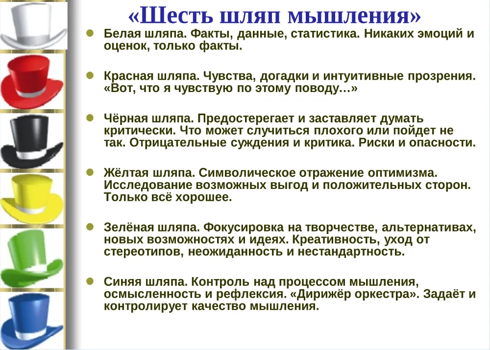 Метод шести шляп позволяет взглянуть на проблему с разных сторон. Каждая «шляпа» символизирует определенный способ мышления: