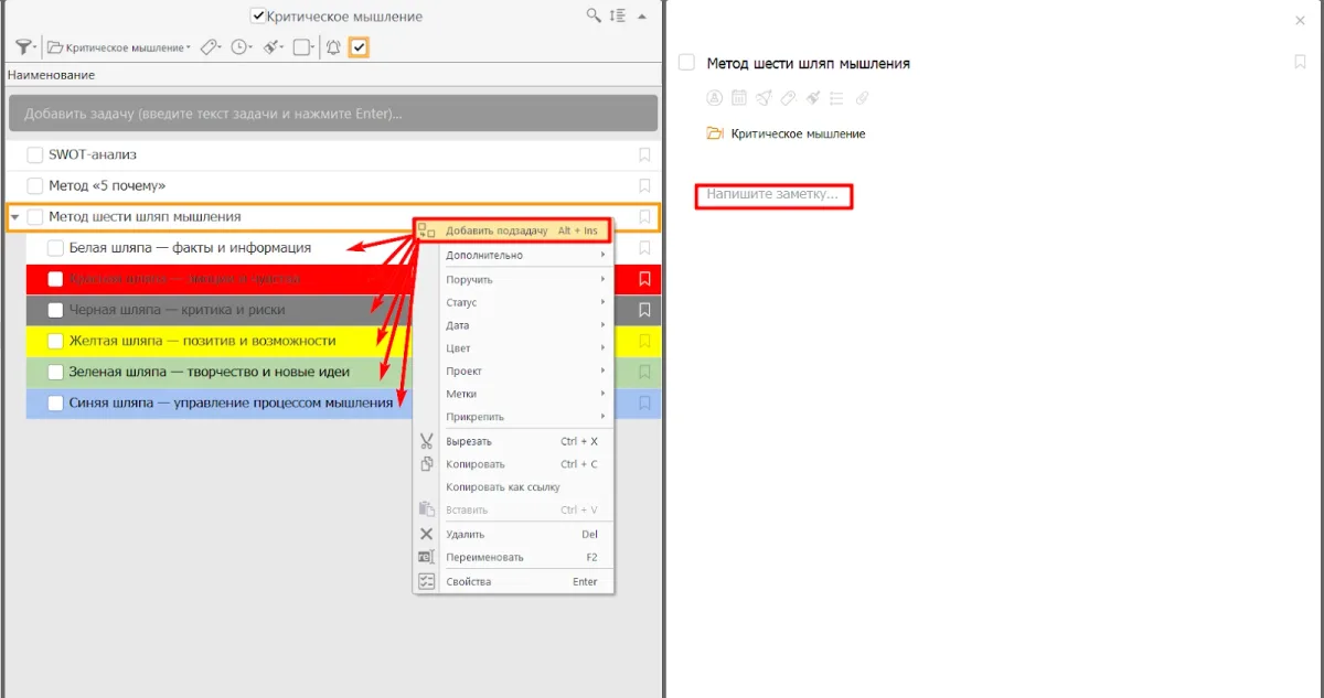 В каждом методе добавьте характерные для него заметки-подзадачи, например, «Метод шести шляп» разделите на «шляпы», где вы будете добавлять соответствующие записи.