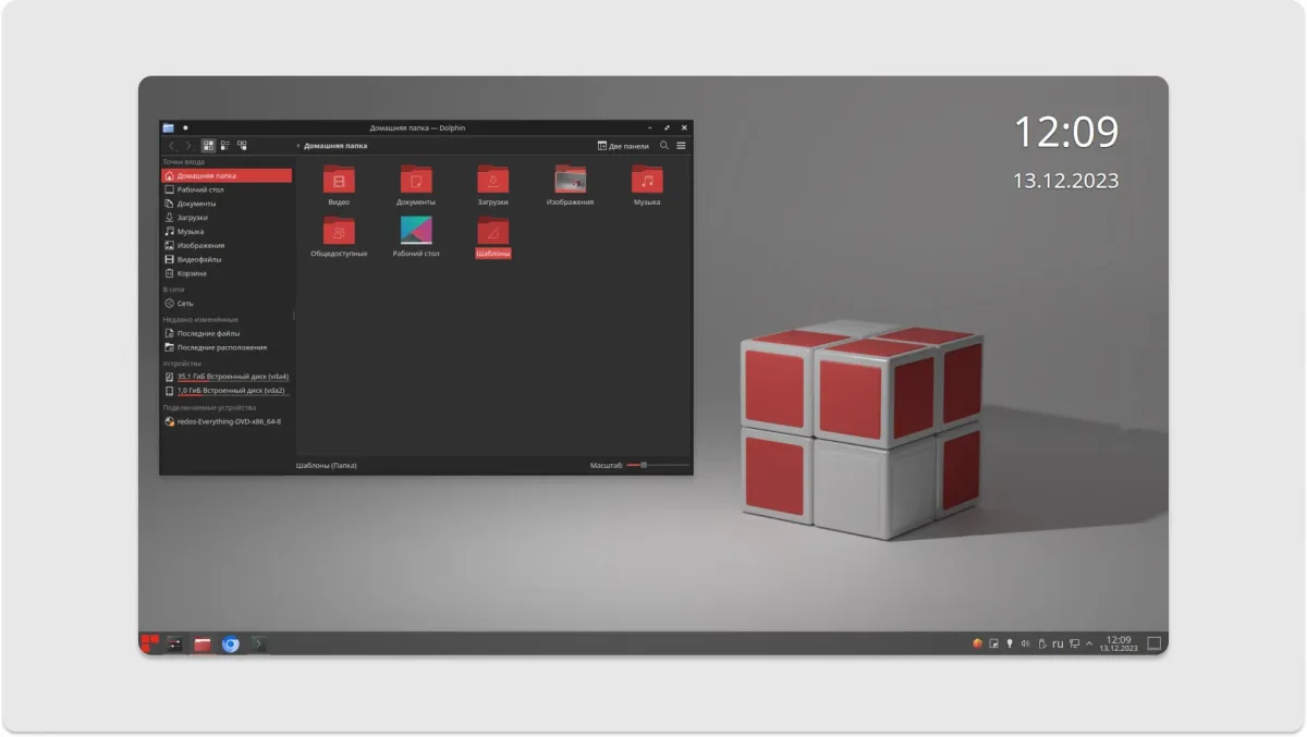 Главное отличие «Ред ОС» от Windows — открытый исходный код, что даёт возможность адаптировать систему под конкретные задачи. Интерфейс дистрибутива напоминает привычную Windows: есть панель управления, кнопка «Пуск» и возможность работать с файлами NTFS. Встроенные приложения включают офисный пакет LibreOffice, браузер Chromium и почтовый клиент Thunderbird.