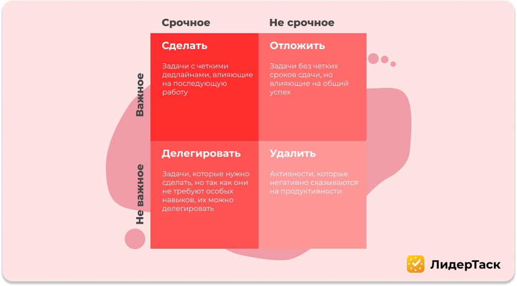 Задачи из этой группы — самые ценные, потому что они двигают вас вперед. Их нужно планировать и выполнять постепенно, не откладывая.