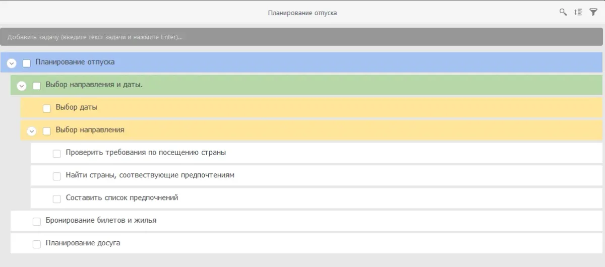 Принцип набегающей волны помогает постепенно уточнять детали по мере необходимости. Чтобы не планировать всё и сразу, лучше сконцентрироваться на выборе направления и даты. Эту задачу можно разбить на подзадачу: выбрать направление и выбрать дату.