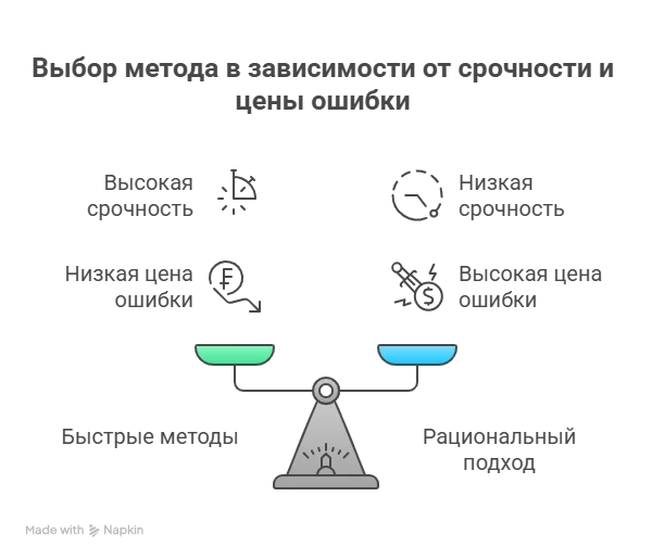 Базируется на внутреннем «чутье». Подходит для простых задач или когда времени на сбор информации совсем нет. Главный риск — высокая субъективность и зависимость от эмоционального состояния.