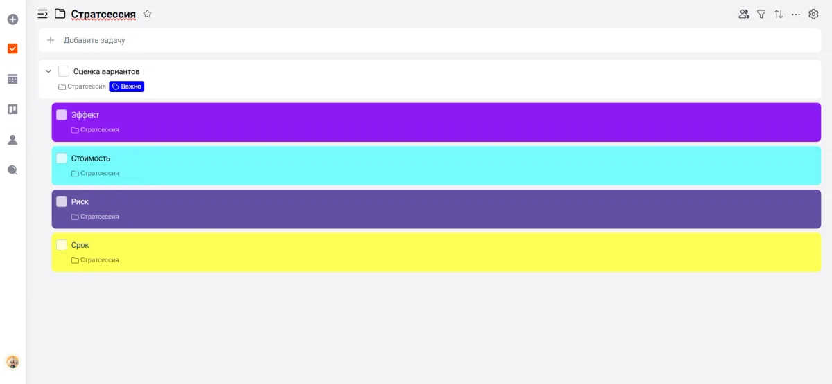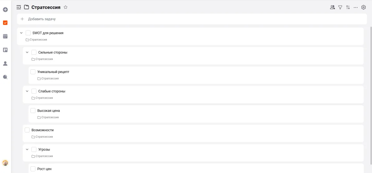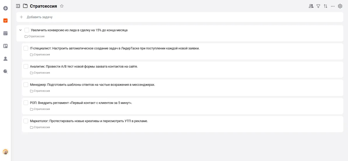 Совет: чтобы творческий процесс не превратился в пустые разговоры — фиксируйте каждую идею мгновенно. Создайте в ЛидерТаске отдельный проект «Стратсессия». Это лучший способ сохранить массив данных для последующего анализа, превращая хаотичные мысли в фундамент для принятия решений.