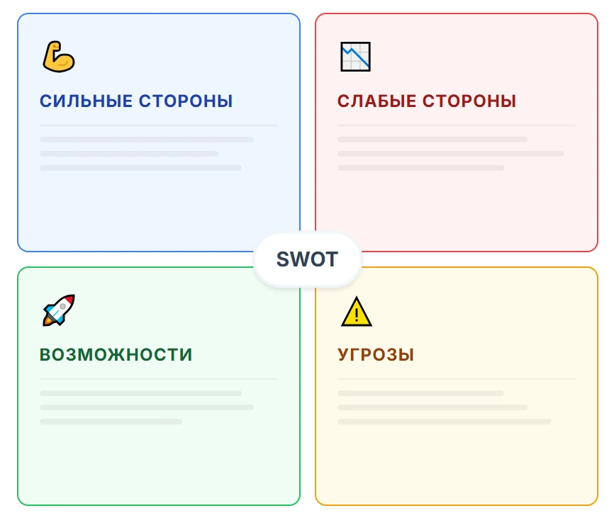 Для каркаса используйте SWOT-анализ. Такой подход позволяет разложить факторы на зоны: сильные и слабые стороны организации, возможности и угрозы. Это помогает увидеть неочевидные риски и вовремя скорректировать процесс.