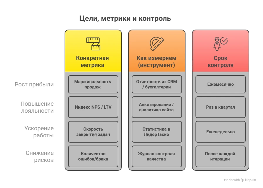 Они должны напрямую вытекать из вашей цели. Если цель — качество, измеряйте процент брака. Если цель — захват рынка, измеряйте долю присутствия.