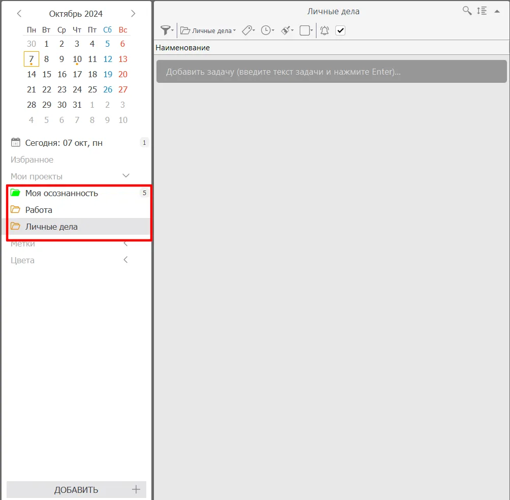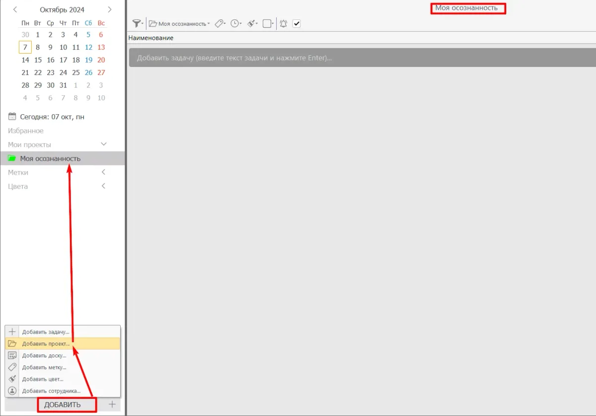 - Нажмите «Добавить проект» и назовите его «Моя осознанность».