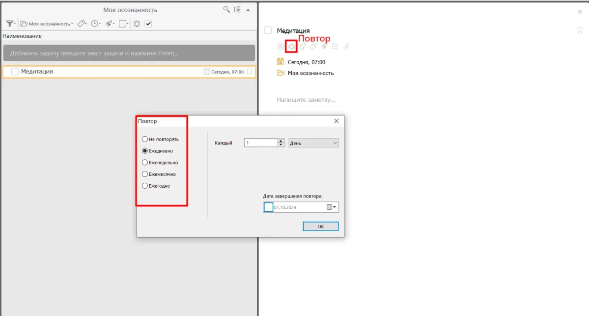 - Медитация. Установите повторяющееся напоминание (например, каждое утро в 7:00).