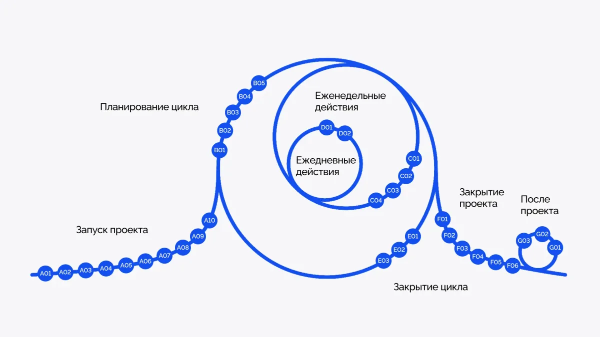 В отличие от сложных методологий — PMBOK или PRINCE2 — P3.express предлагает минималистичный подход, основанный на 33 чётко определённых действиях, разделённых на циклы для легкого управления.