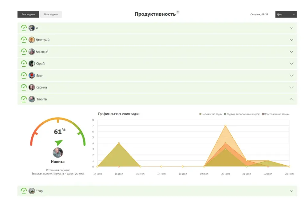 Например, просматривайте сколько задач было поручено, сколько выполнено и просрочено. Таким образом вы всегда будете в курсе текущего состояния проекта.