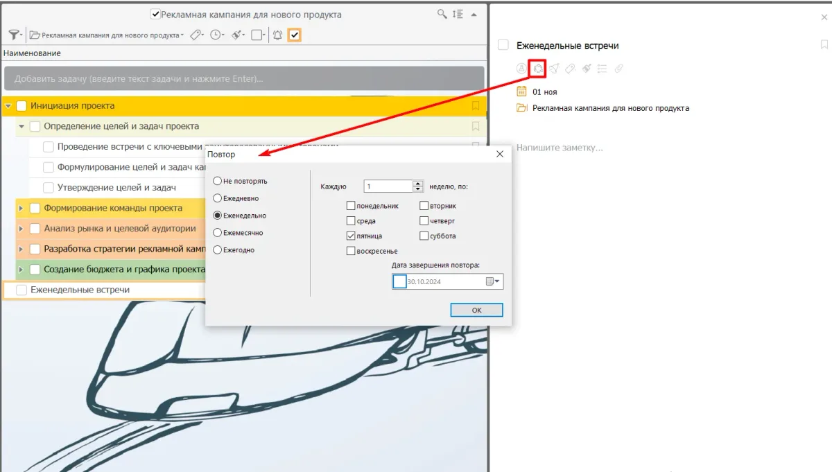 Шаг 5. Установите повтор для регулярных встреч по оценке прогресса. Это позволит не создавать задание заново, а также поможет команде оставаться на одной волне и корректировать курс при необходимости.