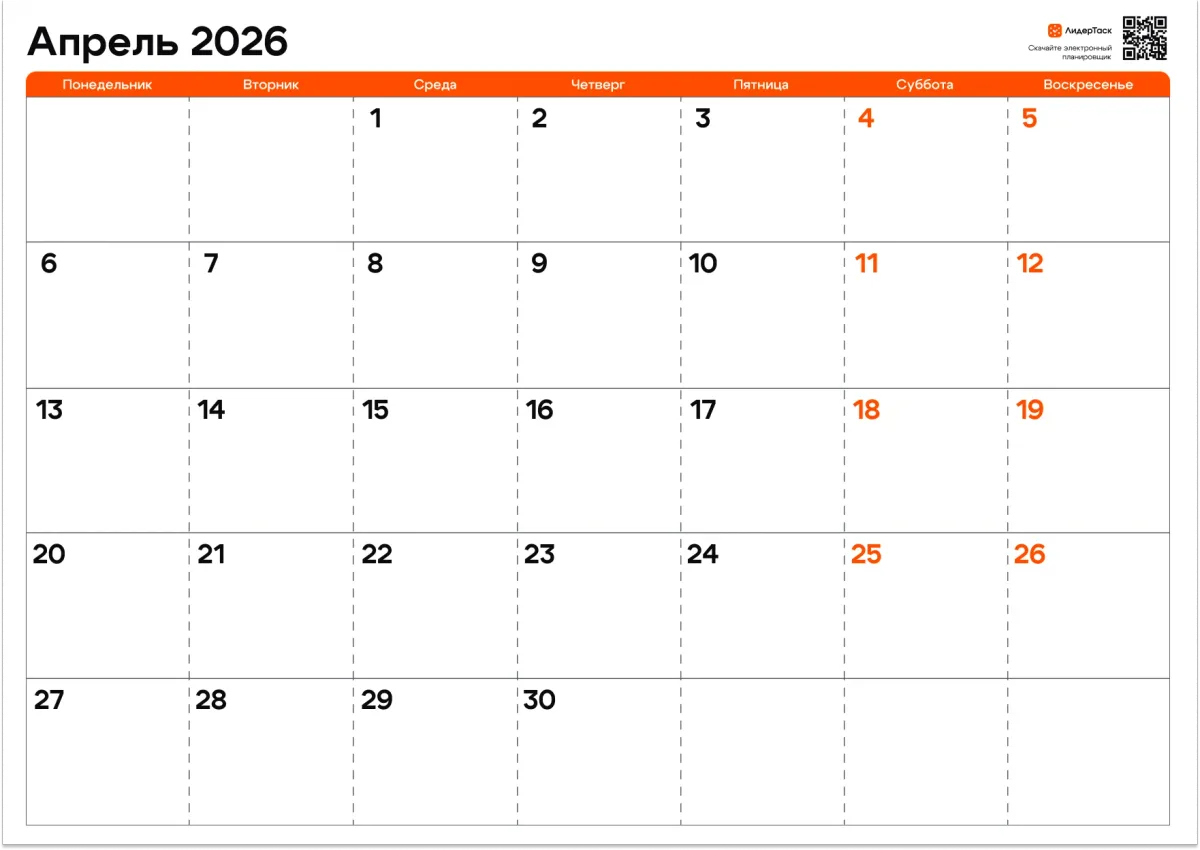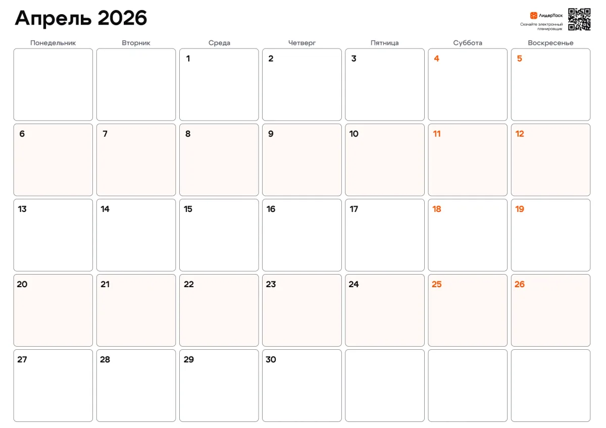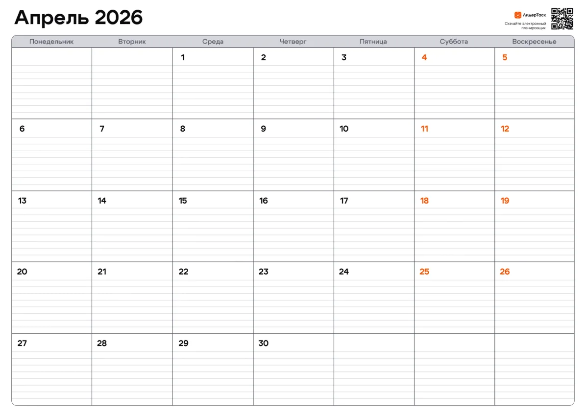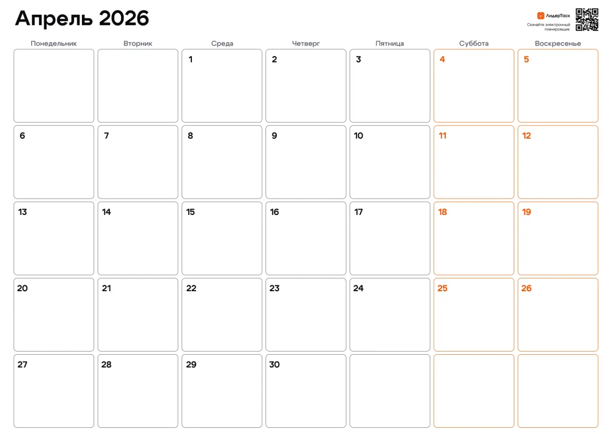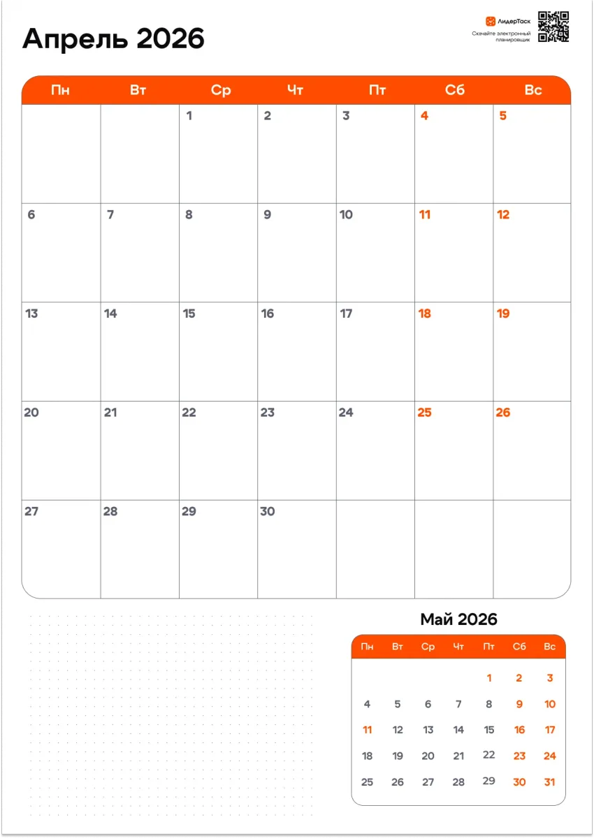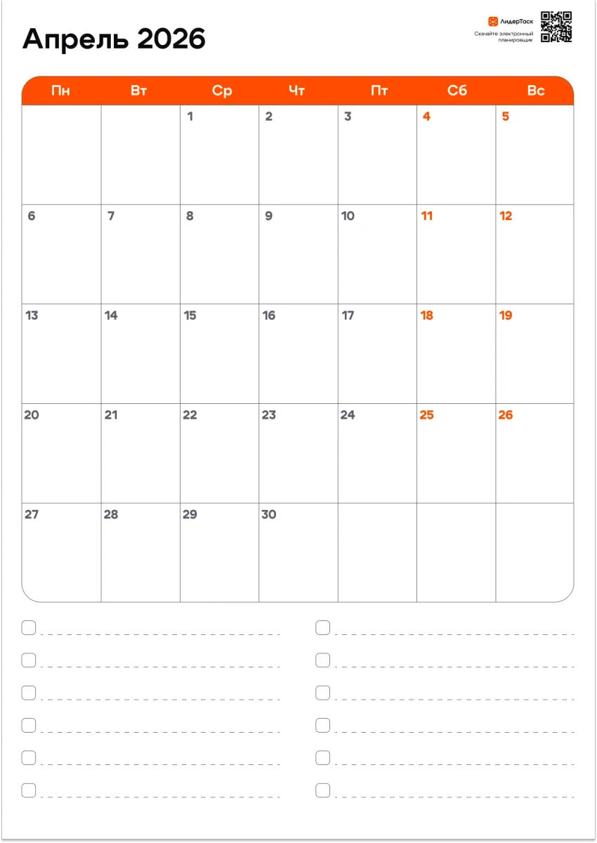 Если нужно не только распечатать страницу, но и вести задачи, напоминания и цели — в ЛидерТаск ты сможешь управлять апрелем интерактивно: отмечать выполненное, переносить планы и видеть весь месяц целиком.