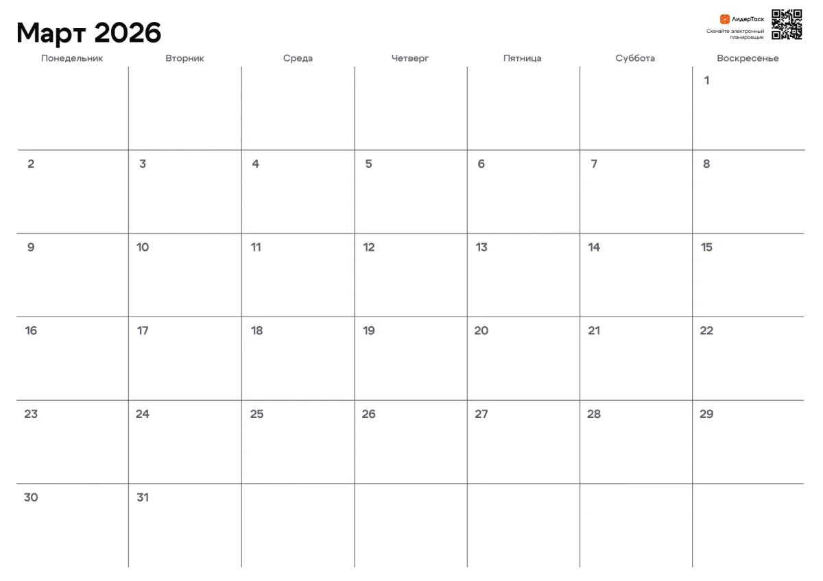 Если нужно не только распечатать страницу, но и вести задачи, напоминания и цели — в ЛидерТаск ты сможешь управлять январем интерактивно: отмечать выполненное, переносить планы и видеть весь месяц целиком.