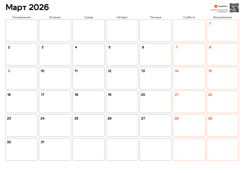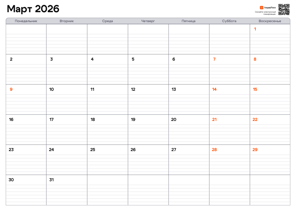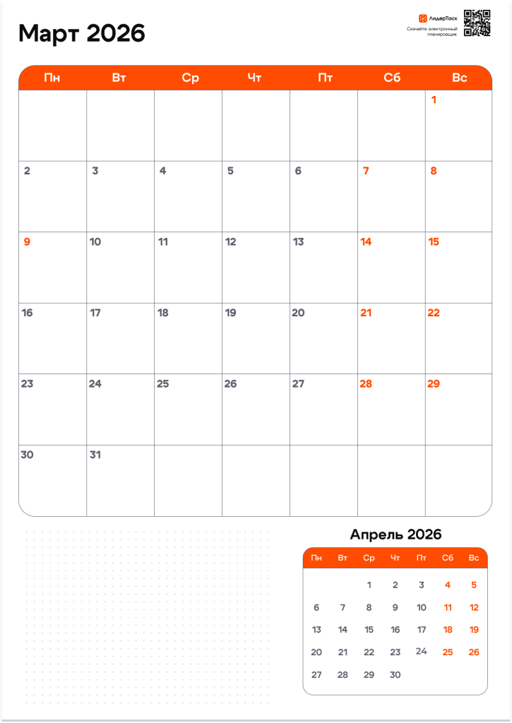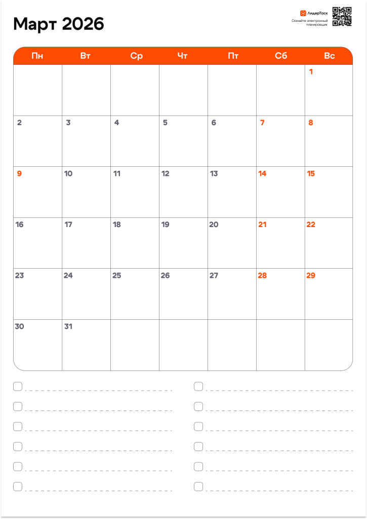 Вертикальный шаблон на Март 2026 с полями для записи важных задач и целей на месяц.
