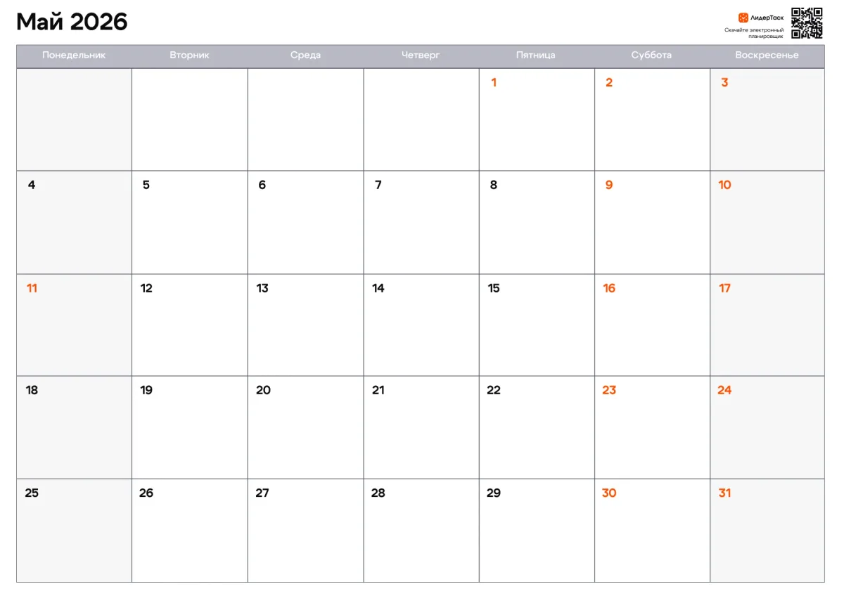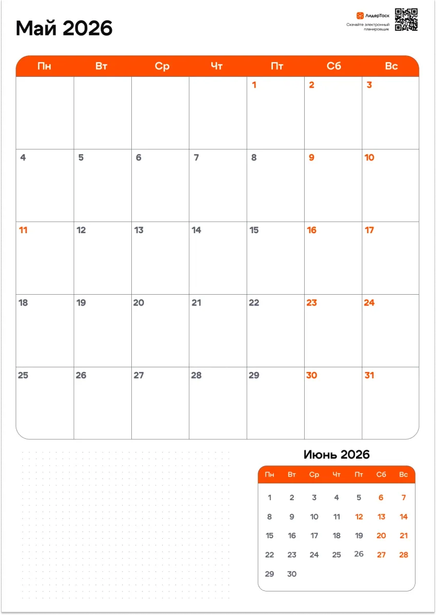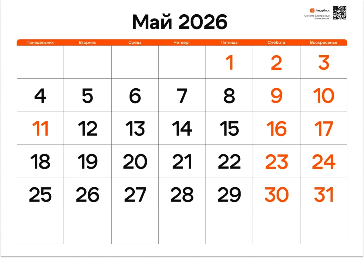 Планируй каждый день мая в цифровом формате, добавляй задачи и события, получай напоминания о праздниках и дедлайнах и синхронизируй всё на телефоне и компьютере автоматически. ЛидерТаск обновляется вместе с календарём без скачиваний и распечаток — начни сегодня и почувствуй, как майские дни проходят осознанно, а не пролетают незаметно.