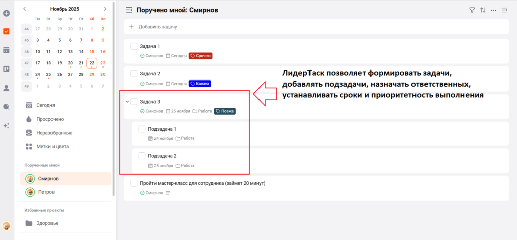 Чтобы процесс стал прозрачным, делегируйте рутину цифровым помощникам. Профессиональный планировщик ЛидерТаск объединяет все виды деятельности в одном окне. Вы можете ставить задачи, распределять поручения, следить за сроками и видеть реальную загрузку команды. Это позволяет руководителю заниматься своим главным делом — принимать решения и вести команду к цели.