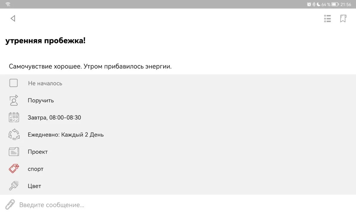 Вы можете писать заметки к задаче.** **Они помогут следить за самочувствием и настроением и, при необходимости, корректировать курс.