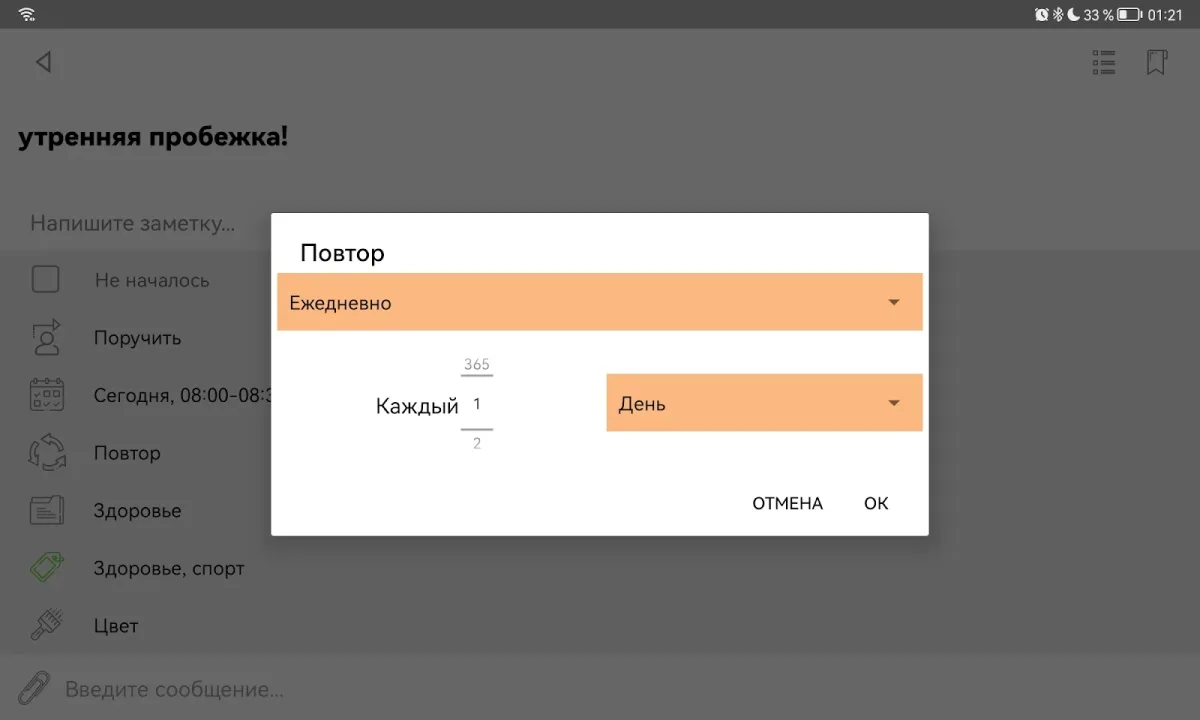 возможность настроить повторяющиеся задачи с разным интервалом: каждый день или раз в неделю.