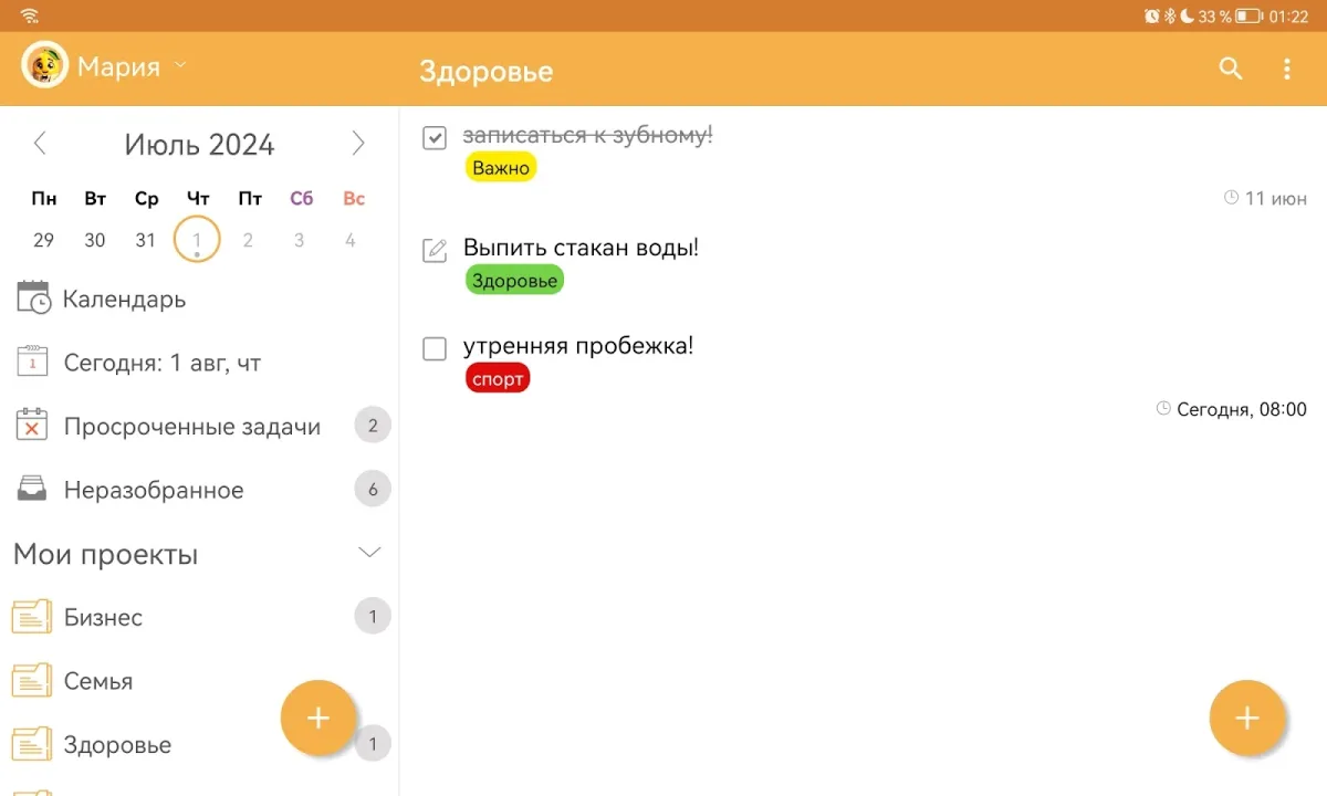 возможность ставить метки к задачам. По умолчанию их всего три, но можно создавать свои, относя задачи к разным категориям. Например, создать метку “здоровье” и поместить туда соответствующие привычки: “выпить стакан воды”, “сделать пробежку” и так далее.