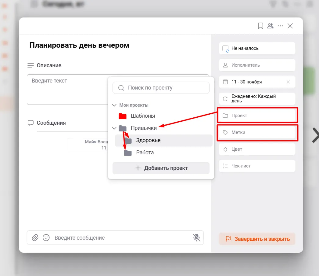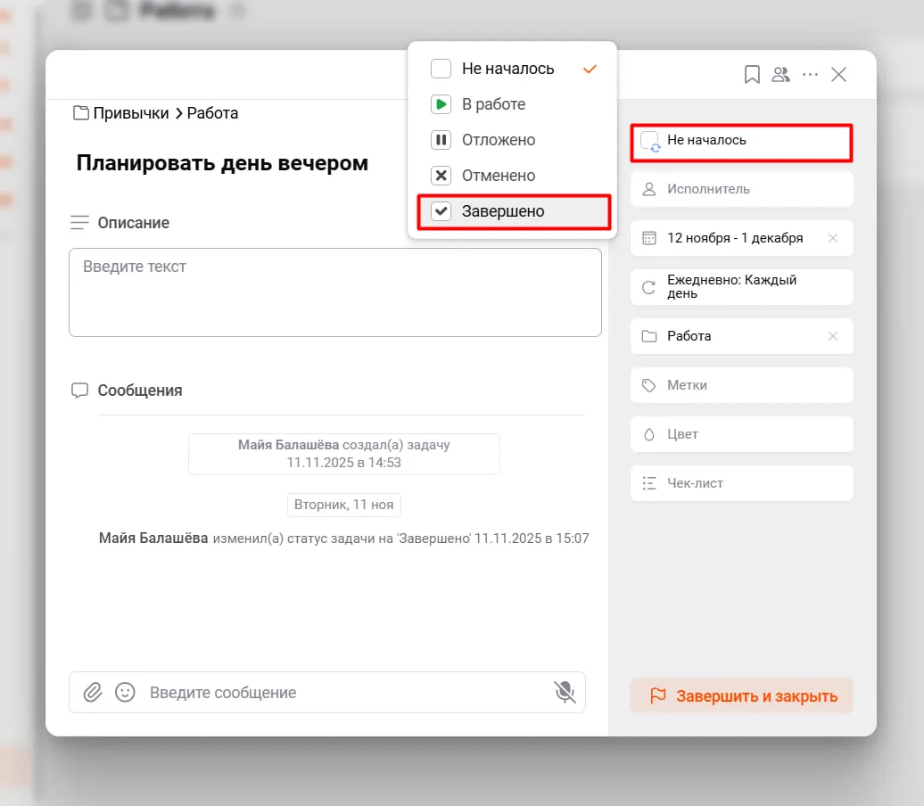 - Создайте задачу-привычку. Например: «10 минут зарядки», «Пить воду каждый час» или «Планировать день вечером».