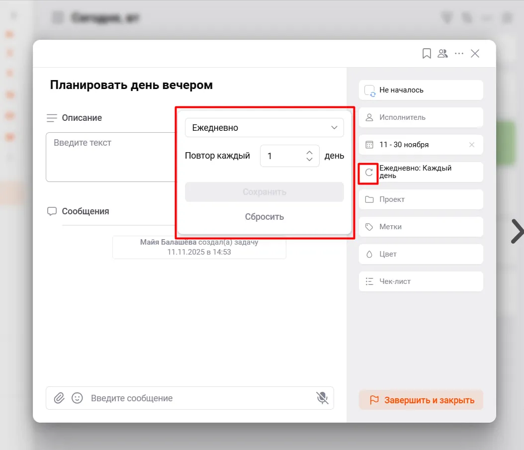 - Задайте повторение. Пусть планировщик напоминает об этом автоматически — ежедневно, в удобное время.