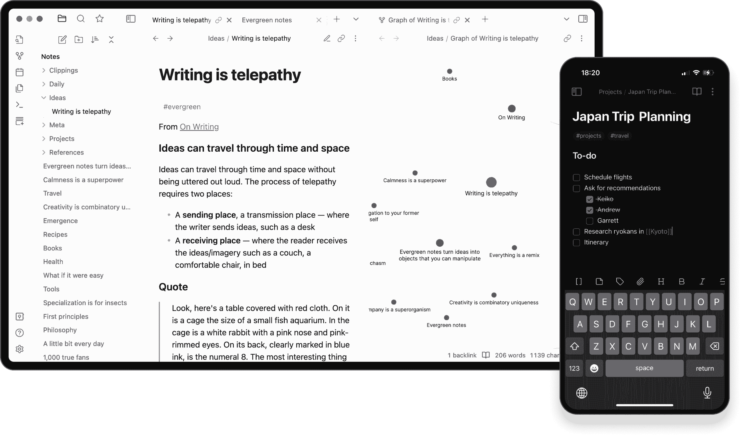 - Obsidian — двусторонние ссылки, граф знаний, плагины, локальное хранение.