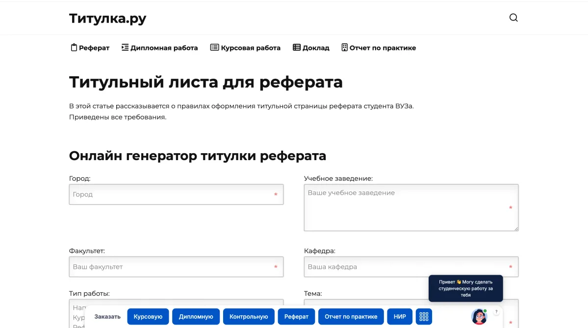 Титулка автоматизирует оформление титульных листов для курсовых и дипломных работ. Сервис помогает студентам быстро и правильно оформлять документы в соответствии с ГОСТами. Пользователи могут настраивать параметры оформления и сохранять готовые шаблоны.