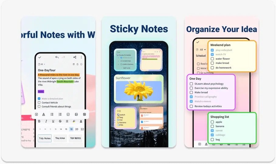 Еще не могу не отметить то, что оформление заметок и самого приложения можно менять по желанию, например, изменить цветовую схему приложения или фон заметок, а также в самих заметках поменять шрифты, цвет и размер текста, добавлять стикеры.