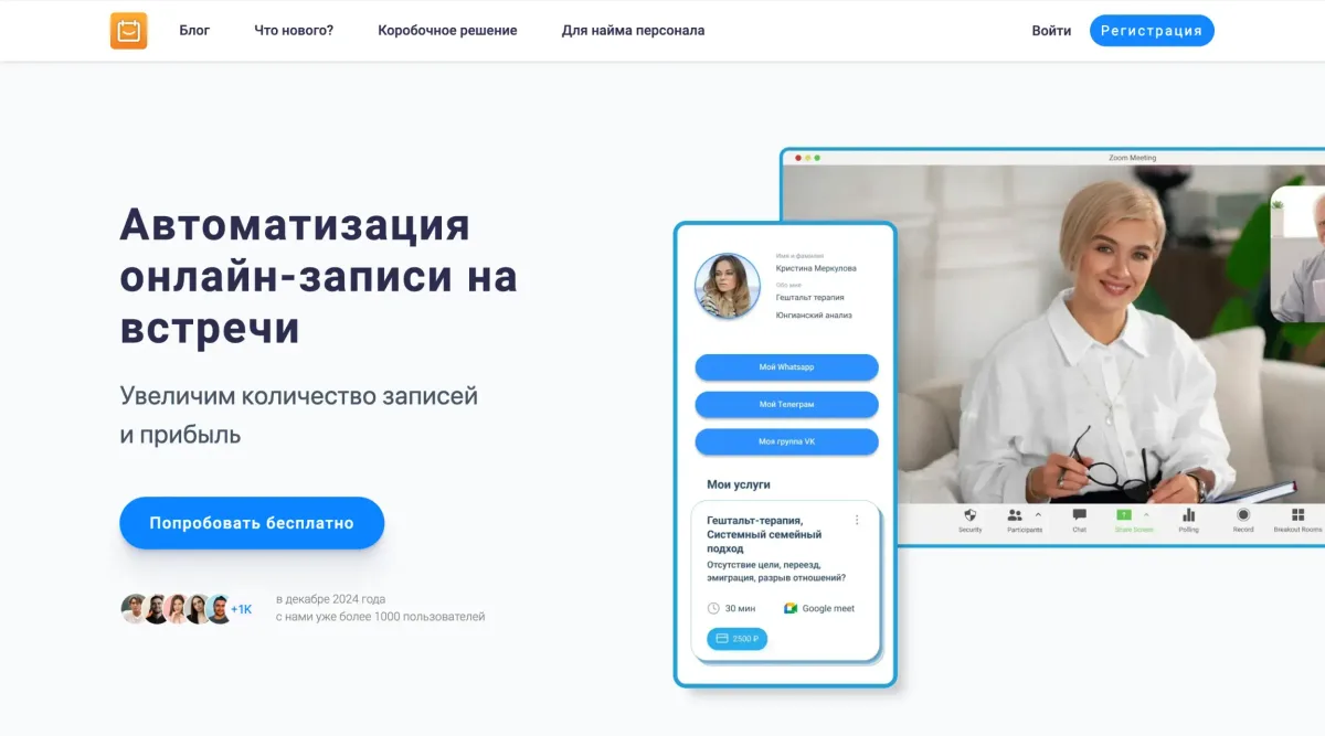 Zoom — идеальный инструмент для проведения онлайн-консультаций, который используют многие психологи. Сервис позволяет проводить видеоконференции высокого качества с клиентами из любого места. Включает функции записи встреч для дальнейшего анализа и работы с клиентами. Подходит как для индивидуальных, так и для групповых консультаций. Дополнительно предлагает инструменты для взаимодействия, такие как чат и файлообмен.