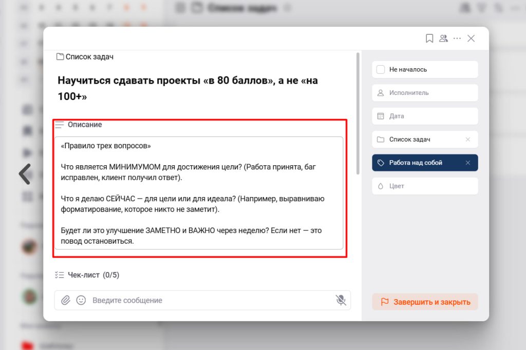 Хорошее рабочее правило — 80%: если результат соответствует задаче достаточно хорошо, пусть даже неидеально, но уже отлично для данного случая, можно закрывать и переходить дальше. Это снижает прокрастинацию и помогает завершать дела вовремя.