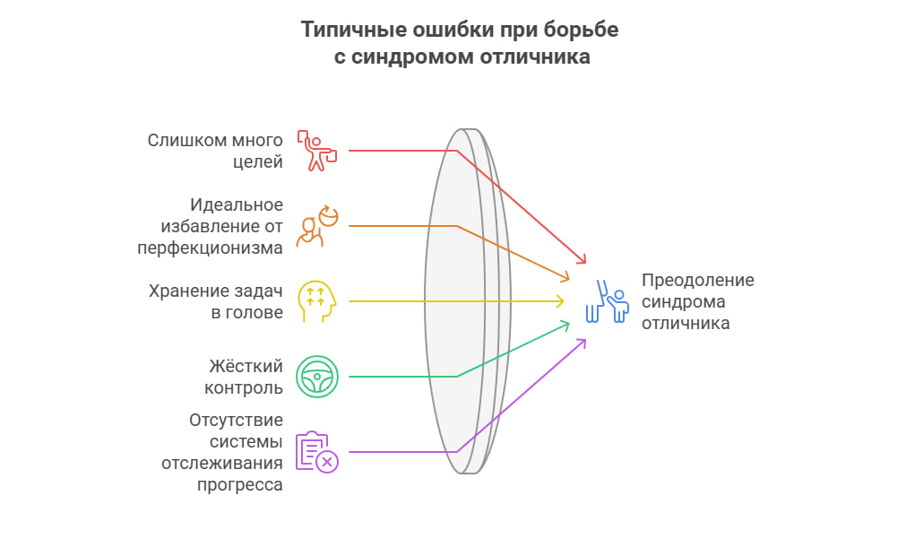 Попытка избавиться от завышенных требований с помощью тех же инструментов — давления, контроля и жёстких планок — лишь усиливает проблему. Ниже — основные ошибки, которые мешают справиться с состоянием и удерживают человека в перфекционистском сценарии.