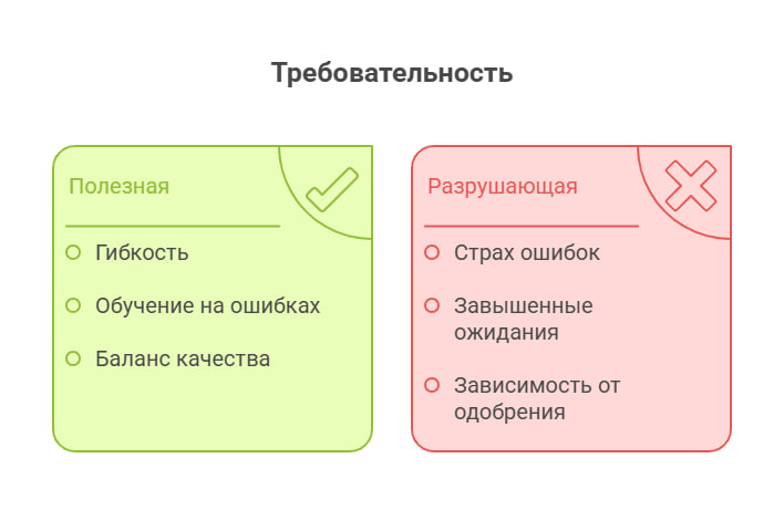 Важно уметь различать здоровые рабочие стандарты и те требования к себе, которые превращаются в источник стресса. Умеренная требовательность помогает расти, улучшать навыки и выполнять задачи качественно. Разрушающий перфекционизм, напротив, заставляет стремиться к недостижимому результату любой ценой и делает человека зависимым от внешней оценки.