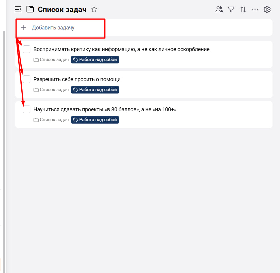 Упорядоченный список задач делает цели достижимыми: большой объём перестаёт пугать, потому что появляется ясность, где начало, где конец и что идёт между ними. Вместе с этим уходит страх ошибиться и снижается тяга бесконечно дорабатывать детали, которые не влияют на результат.